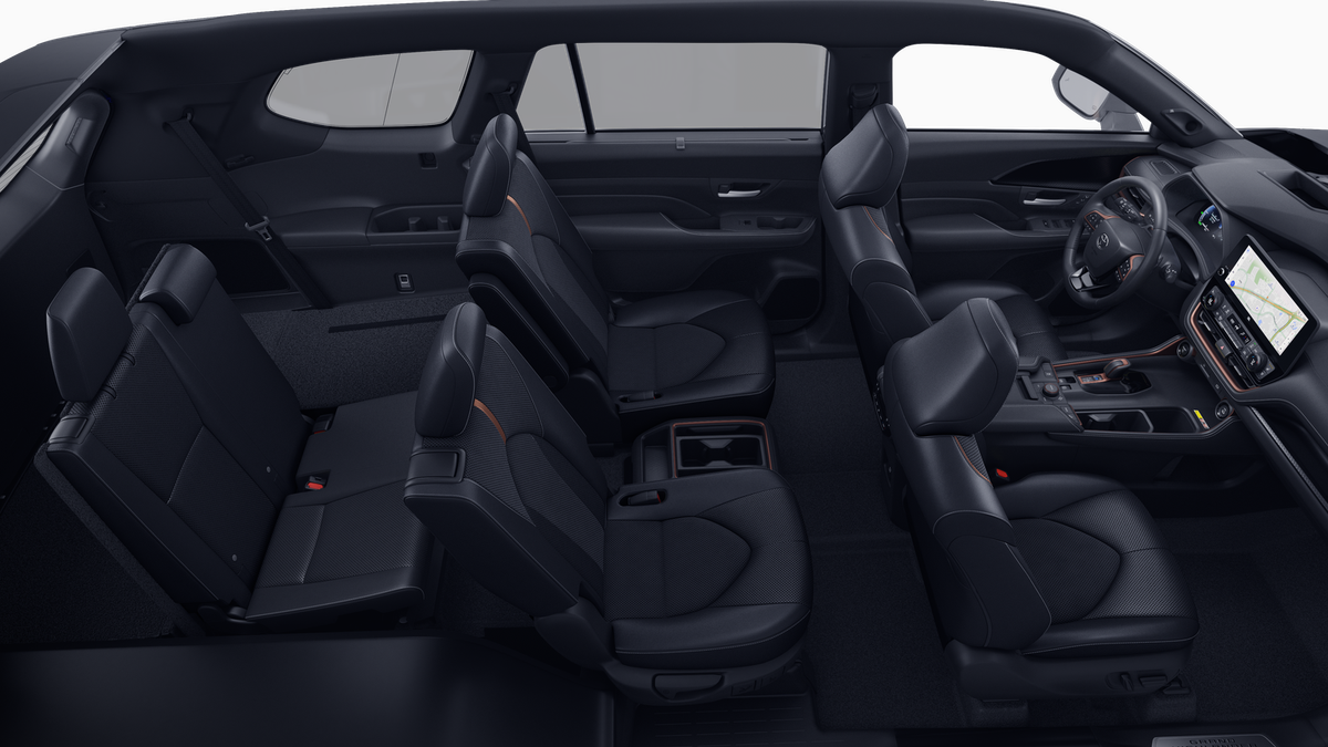 • 7-passenger seating with second-row fold-down captain's chairs and fold-down inboard armrests, adjustable headrests and two cup holders mounted on the floor; and 60/40 split, fold-down third-row seats with sliding headrests and recline function
