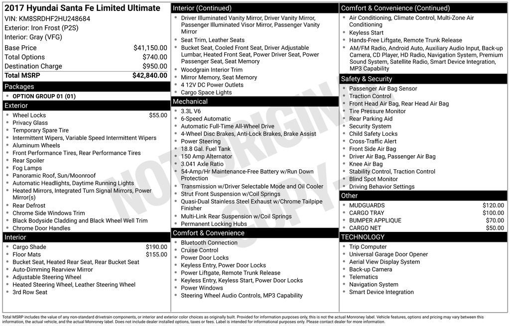 Recent Arrival! 2017 Iron Frost Hyundai Santa Fe Limited Ultimate AWD This Hyundai Santa Fe has many features and is well equipped including. Navigation System / GPS, Leather Seats, Sunroof / Moonroof, AWD/4X4/4WD, Heated Seats, Backup Camera, Power Liftgate, Blind-Spot Monitors, Bluetooth® Hands-Free, Navigation System, Option Group 01.