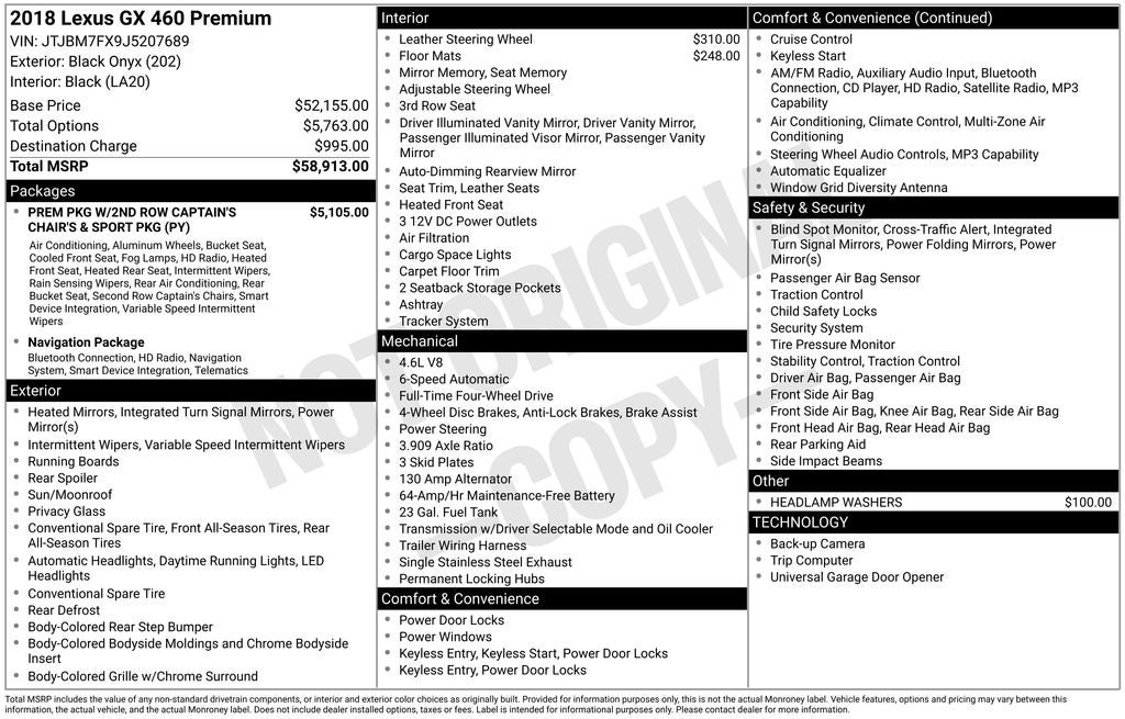 Recent Arrival! 2018 Black Onyx Lexus GX 460 4WD This Lexus GX has many features and is well equipped including. Navigation System / GPS, Leather Seats, Sunroof / Moonroof, AWD/4X4/4WD, Heated and Cooled Seats, Backup Camera, 3rd Row Seating, Power Liftgate, Blind-Spot Monitors, Bluetooth® Hands-Free, Power Seats, Dual Front & Rear Auto Air Conditioner, Front & Rear Heated Seats, Intuitive Parking Assist, Leather Seat Trim, LED Front Fog & Driving Lamp, Lexus Enform Destinations, Navigation Package, Premium Package, Rain Sensing Intermittent Wipers, Ventilated Front Seats, Wheels: 18 x 7.5J Split 6-Spoke Aluminum Alloy, Windshield De-Icer.