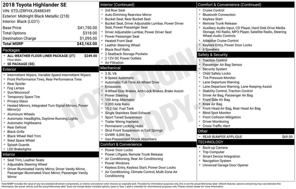 Recent Arrival! 2018 Midnight Black Metallic Toyota Highlander SE AWD This Toyota Highlander has many features and is well equipped including. Navigation System / GPS, Leather Seats, Sunroof / Moonroof, AWD/4X4/4WD, Heated Seats, Backup Camera, 3rd Row Seating, Blind-Spot Monitors, Bluetooth® Hands-Free, ABS brakes, Active Cruise Control, Alloy wheels, Electronic Stability Control, Front dual zone A/C, Heated door mirrors, Heated front seats, Illuminated entry, Leather Seat Trim, Low tire pressure warning, Navigation System, Power Liftgate, Power moonroof, Remote keyless entry, Traction control.