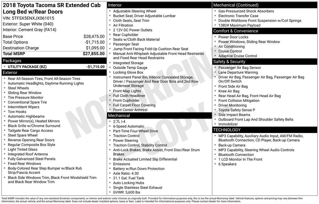 Recent Arrival! 2018 Super White Toyota Tacoma SR 4WD This Toyota Tacoma has many features and is well equipped including. AWD/4X4/4WD, Backup Camera, Bluetooth® Hands-Free, ABS brakes, Active Cruise Control, Black Rear Bumper, Electronic Stability Control, Fabric Seat Trim (FA), Illuminated entry, Low tire pressure warning, Rear Cupholder Delete, Rear Headrests Delete, Rear Seat Belts Delete, Traction control, Utility Package.
