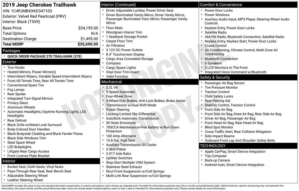 Recent Arrival! 2019 Velvet Red Pearlcoat Jeep Cherokee Trailhawk 4WD This Jeep Cherokee has many features and is well equipped including. AWD/4X4/4WD, Backup Camera, Blind-Spot Monitors, Keyless Access with Push Button Start, Automatic Headlights, Apple CarPlay, Android Auto, Bluetooth® Hands-Free, Quick Order Package 27E Trailhawk.
