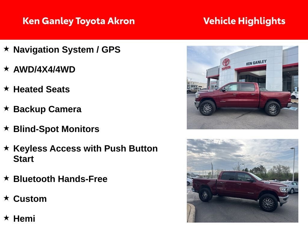 Thank you for taking the time to look at this good-looking 2019 Ram 1500. As you do your comparison shopping, you will see Ganley Automotive offers some of the best values in the market. We will provide you a Carfax, Comprehensive Vehicle Inspection, and how we arrived at the price. We are located at 1395 E Market street in Akron, OH 44305. Please call 330-733-7511 to speak with a salesman about this vehicle. Out of town buyers free pick-up at the airport. We can help arrange delivery right to your front door too!