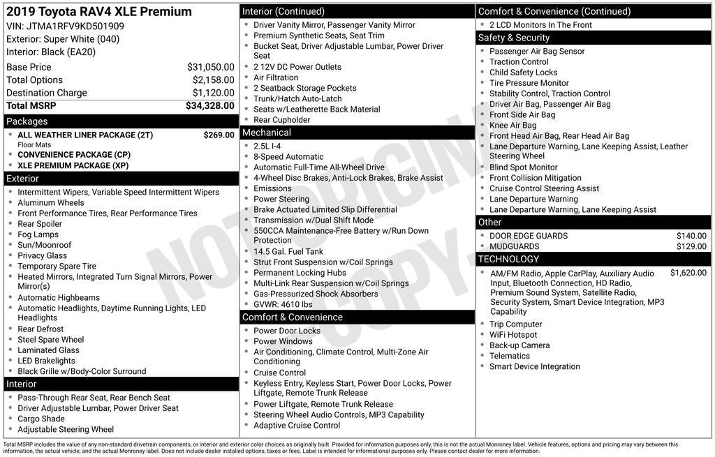 Recent Arrival! 2019 Super White Toyota RAV4 XLE Premium AWD This Toyota RAV4 has many features and is well equipped including. Sunroof / Moonroof, AWD/4X4/4WD, Backup Camera, Blind-Spot Monitors, Apple CarPlay, Android Auto, Bluetooth® Hands-Free, JBL AUDIO, 3 Spoke Leather Steering Wheel, 8-Way Power-Adjustable Driver's Seat w/Lumbar Support, Anti-Theft System, Convenience Package, Power Liftgate, Power moonroof, Radio: Entune 3.0 Audio Plus & JBL w/Clari-Fi.