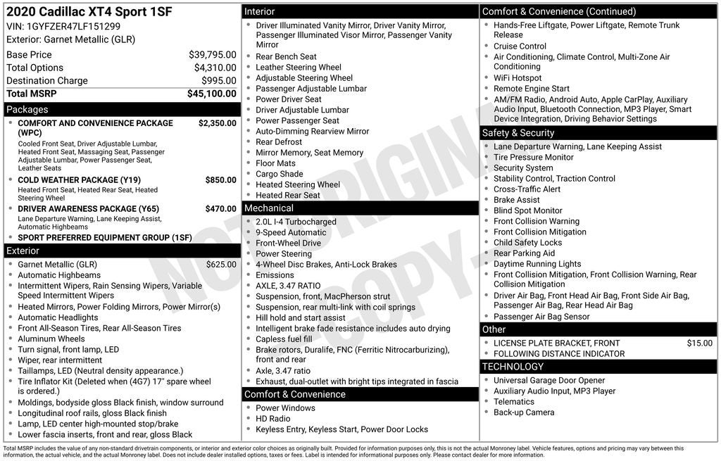 2020 Garnet Metallic Cadillac XT4 Sport FWD This Cadillac XT4 has many features and is well equipped including. Leather Seats, Heated and Cooled Seats, Remote Start, Heated Steering Wheel, Backup Camera, Power Liftgate, Blind-Spot Monitors, Automatic Headlights, Apple CarPlay, Android Auto, Bluetooth® Hands-Free, 4.2 Diagonal Color Display Driver Info Center, 6-Way Power Passenger Seat Adjuster, 8-Way Power Passenger Seat Adjuster, Auto-Dimming Inside Rear-View Mirror, Automatic Emergency Braking, Body-Color Heated Power-Adjustable Outside Mirrors, Cold Weather Package, Comfort & Convenience Package, Cruise Control w/Set & Resume Speed, Driver Awareness Package, Following Distance Indicator, Front & Rear Park Assist, HD Rear Vision Camera, Heated Automatic Steering Wheel, Heated Driver & Front Passenger Seats, Heated Rear Outboard Seating Positions, IntelliBeam Automatic High Beam Control, Lane Keep Assist w/Lane Departure Warning, Manual Rake & Telescopic Steering Column, Power Lumbar Massage Driver Seat, Power Lumbar Massage Front Passenger Seat, Preferred Equipment Group 1SF, Ventilated Driver & Front Passenger Seats.
