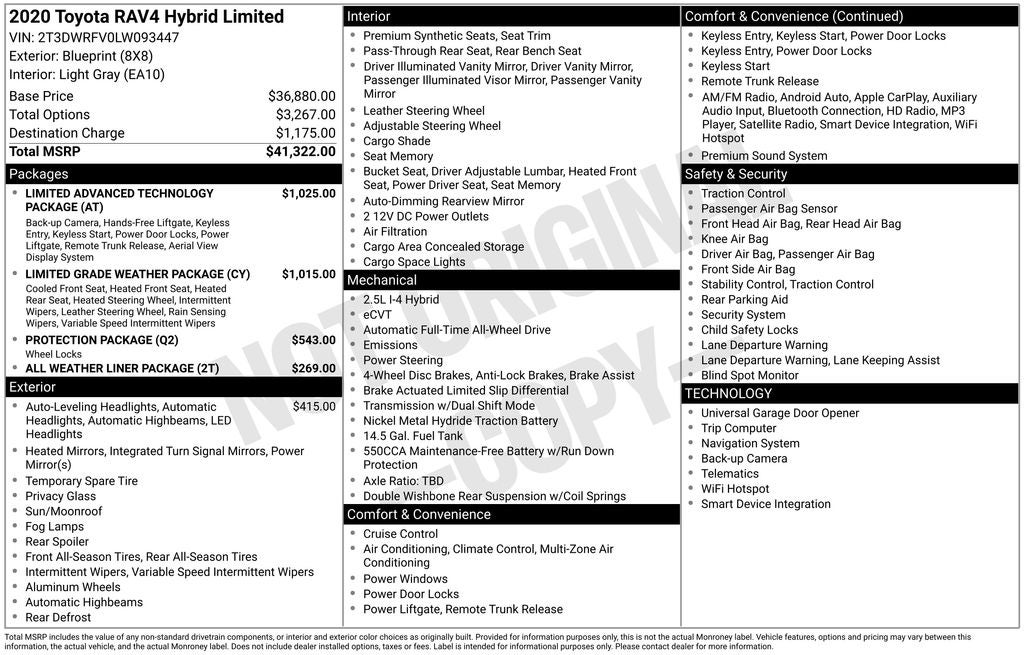 Recent Arrival! 2020 Blueprint Toyota RAV4 Hybrid Limited AWD This Toyota RAV4 Hybrid has many features and is well equipped including. Navigation System / GPS, Leather Seats, Sunroof / Moonroof, AWD/4X4/4WD, Heated and Cooled Seats, Heated Steering Wheel, Backup Camera, Collision Avoidance System, Blind-Spot Monitors, Keyless Access with Push Button Start, Automatic Headlights, Apple CarPlay, Android Auto, Bluetooth® Hands-Free, All Weather Floor Liners, All Weather Liner Package, Bird's Eye View Monitor, Cargo Liner, Heated 3-Spoke Leather Steering Wheel, Limited Advanced Technology Package, Limited Grade Weather Package, Navigation System, Rain Sensing Front Wipers, Rear Outboard Seat Heating, Smart Key System w/Push Button Start, Wireless Smartphone Charger.