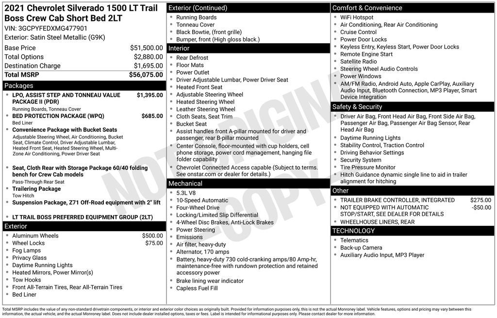 Recent Arrival! 2021 Satin Steel Metallic Chevrolet Silverado 1500 LT Trail Boss 4WD This Chevrolet Silverado 1500 has many features and is well equipped including. AWD/4X4/4WD, Heated Seats, Backup Camera, Apple CarPlay, Android Auto, Bluetooth® Hands-Free, 10-Way Power Driver Seat w/Lumbar, 12-Volt Rear Auxiliary Power Outlet, 170 Amp Alternator, 2 USB Ports (First Row), 4.2 Diagonal Color Display Driver Info Center, 4 Black Round Assist Steps (LPO), 4G LTE Wi-Fi Hot Spot Capable, 6-Speaker Audio System, All-Weather Floor Liner (LPO) (AAK), Assist Step & Tonneau Value Package II (LPO), Auto-Locking Rear Differential, Auxiliary External Transmission Oil Cooler, Bed Protection Package, Bluetooth® For Phone, Chevrolet Connected Access Capable, Chevytec Spray-On Black Bedliner, Cloth Rear Seat w/Storage Package, Color-Keyed Carpeting Floor Covering, Compass, Convenience Package w/Buckets Seats, Deep-Tinted Glass, Dual Exhaust w/Polished Outlets, Dual-Zone Automatic Climate Control, Electric Rear-Window Defogger, Electrical Lock Control Steering Column, Electronic Cruise Control, EZ Lift Power Lock & Release Tailgate, Floor Mounted Center Console, Front LED Fog Lamps, Heated Driver & Front Outboard Passenger Seats, Heated Steering Wheel, Heavy-Duty Air Filter, High Gloss Black Grille, High Gloss Black Mirror Caps, Hill Descent Control, Hitch Guidance, Keyless Open & Start, Leather Wrapped Steering Wheel, LED Cargo Area Lighting, LED Reflector Headlamps, Manual Tilt/Telescoping Steering Column, OnStar & Chevrolet Connected Services Capable, Performance Red Recovery Hooks, Power Door Locks, Power Front Windows w/Driver Express Up/Down, Power Front Windows w/Passenger Express Down, Power Rear Windows w/Express Down, Preferred Equipment Group 2LT, Rear Dual USB Charging-Only Ports, Rear Vision Camera, Rear Wheelhouse Liners, Remote Vehicle Starter System, SiriusXM Radio, Standard Tailgate, Steering Wheel Audio Controls, Suspension Package, Theft Deterrent System (Unauthorized Entry), Trailering Package, Tri-Fold Soft Tonneau Cover (LPO).