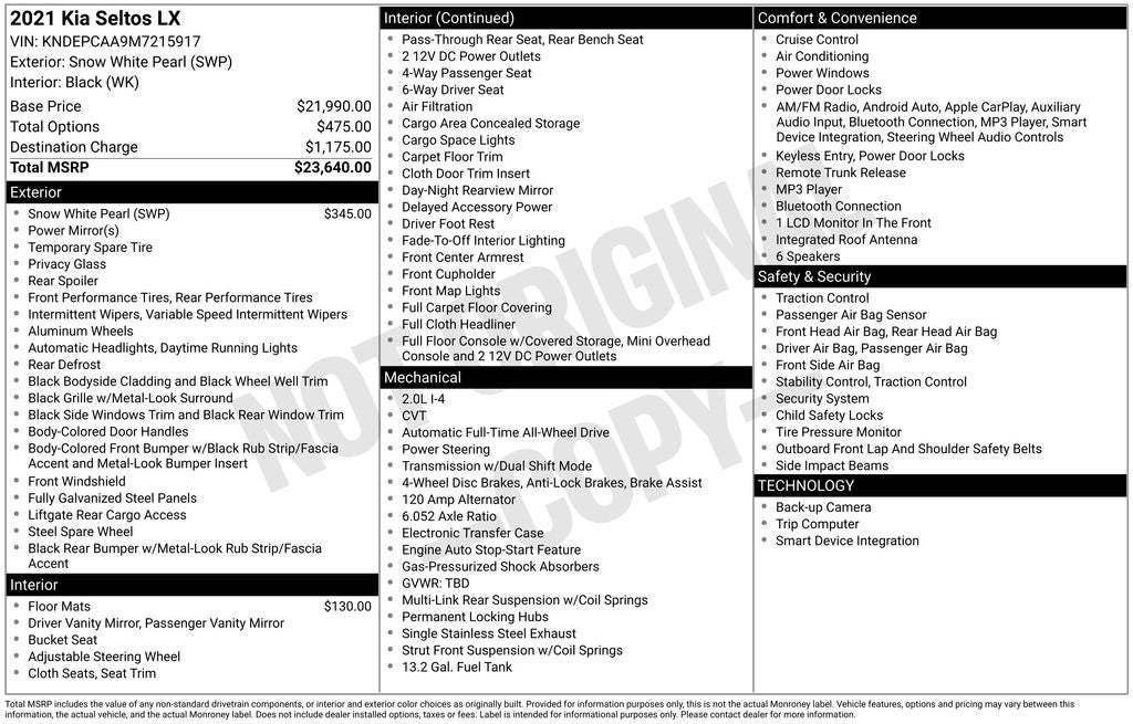 Recent Arrival! 2021 Snow White Pearl Kia Seltos LX AWD This Kia Seltos has many features and is well equipped including. AWD/4X4/4WD, Backup Camera, Bluetooth® Hands-Free.