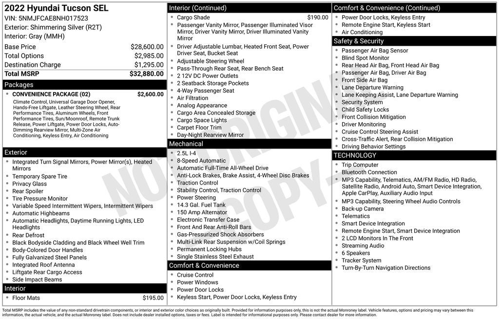 Recent Arrival! 2022 Shimmering Silver Hyundai Tucson SEL AWD This Hyundai Tucson has many features and is well equipped including. Sunroof / Moonroof, AWD/4X4/4WD, Remote Start, Heated Seats, Backup Camera, Collision Avoidance System, Blind-Spot Monitors, Keyless Access with Push Button Start, Automatic Headlights, Apple CarPlay, Android Auto, Bluetooth® Hands-Free, 10.25 Digital Instrument Cluster, Auto-Dimming Interior Mirror w/Homelink, Convenience Package, Digital Key, Dual Automatic Temperature Control, Hands-Free Power Liftgate w/Auto-Open, Leather-Wrapped Shift Knob, Leather-Wrapped Steering Wheel, LED Interior Lights (Room, Map), Option Group 02, Power Sunroof, Ultrasonic Rear Occupant Alert, Wheels: 19 x 7.5J Machine-Face Finish Alloy, Wireless Phone Charging.