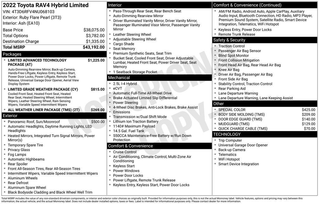 Recent Arrival! 2022 Ruby Flare Pearl Toyota RAV4 Hybrid Limited AWD This Toyota RAV4 Hybrid has many features and is well equipped including. Leather Seats, Sunroof / Moonroof, AWD/4X4/4WD, Heated and Cooled Seats, Heated Steering Wheel, Backup Camera, 360 degree Camera, Collision Avoidance System, Blind-Spot Monitors, Keyless Access with Push Button Start, Automatic Headlights, Apple CarPlay, Android Auto, Bluetooth® Hands-Free, Bird's Eye View Monitor, Digital Rearview Mirror w/Gen 2 HomeLink, Limited Advanced Technology Package, Qi-Compatible Wireless Smartphone Charging, Smart Key System w/Push Button Start.