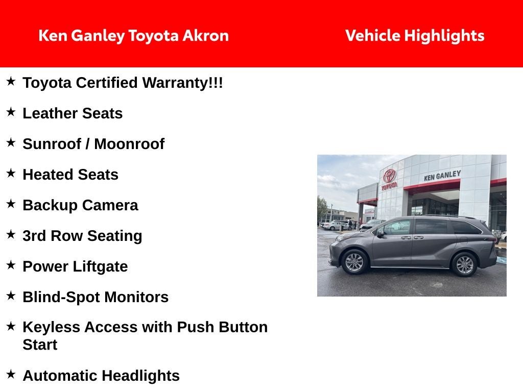 Thank you for taking the time to look at this great 2023 Toyota Sienna. As you do your comparison shopping, you will see Ganley Automotive offers some of the best values in the market. We will provide you a Carfax, Comprehensive Vehicle Inspection, and how we arrived at the price. We are located at 1395 E Market street in Akron, OH 44305. Please call 330-733-7511 to speak with a salesman about this vehicle. Out of town buyers free pick-up at the airport. We can help arrange delivery right to your front door too!