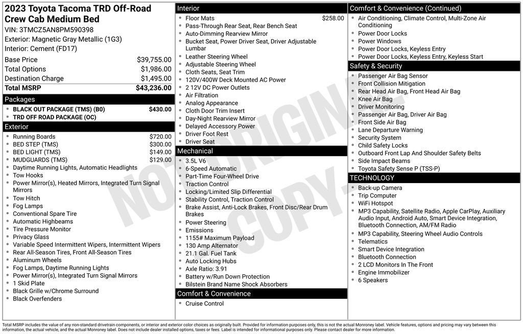 Certified. Recent Arrival! 2023 Magnetic Gray Metallic Toyota Tacoma TRD Off-Road 4WD This Toyota Tacoma has many features and is well equipped including. Toyota Certified Warranty!!!, AWD/4X4/4WD, Backup Camera, Apple CarPlay, Android Auto, Bluetooth® Hands-Free, 120V/400W Deck Mounted AC Power, ABS brakes, Active Cruise Control, Air Conditioning, Alloy wheels, Automatic temperature control, Black Out Package (TMS), Black Overfenders, Electronic Stability Control, Engine Immobilizer, Front Door Smart Key System w/Push Button Start, Front dual zone A/C, Heated door mirrors, Illuminated entry, Low tire pressure warning, Power Sliding Rear Window w/Privacy Glass, Remote keyless entry, Traction control, TRD Off Road Package.