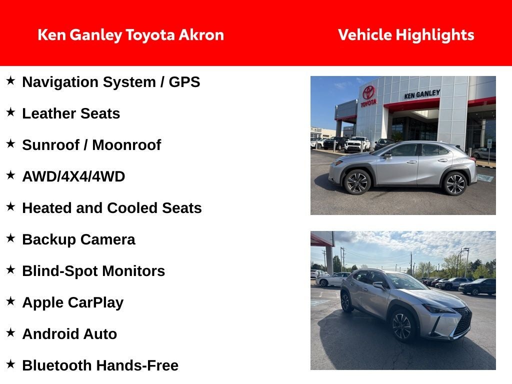 Thank you for taking the time to look at this gorgeous 2024 Lexus UX. As you do your comparison shopping, you will see Ganley Automotive offers some of the best values in the market. We will provide you a Carfax, Comprehensive Vehicle Inspection, and how we arrived at the price. We are located at 1395 E Market street in Akron, OH 44305. Please call 330-733-7511 to speak with a salesman about this vehicle. Out of town buyers free pick-up at the airport. We can help arrange delivery right to your front door too!