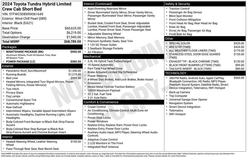 Recent Arrival! 2024 Wind Chill Pearl Toyota Tundra Hybrid Limited 4WD This Toyota Tundra Hybrid has many features and is well equipped including. Leather Seats, Sunroof / Moonroof, AWD/4X4/4WD, Heated and Cooled Seats, Backup Camera, Adaptive Cruise Control, Blind-Spot Monitors, Adaptive Headlights, Keyless Access with Push Button Start, Automatic Headlights, Apple CarPlay, Android Auto, Bluetooth® Hands-Free, 400W/120V AC Rear Seat & Bed Power Supply, ABS brakes, Alloy wheels, Black Overfenders & Rear Bumper, Electronic Stability Control, Front dual zone A/C, Heated & Ventilated Front Bucket Seats, Heated door mirrors, Heated front seats, Heated Leather Steering Wheel, Illuminated entry, Low tire pressure warning, Navigation System, Nightshade Package, Power Package, Power Panoramic Roof, Qi-Compatible Wireless Smartphone Charger, Radio: Premium Audio w/JBL, Remote keyless entry, Traction control, Wheels: 20 x 8J Matte-Black Alloy.