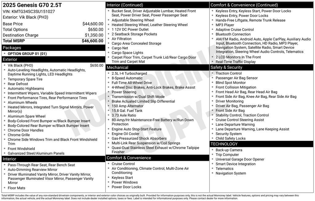 Recent Arrival! 2025 Vik Black Genesis G70 2.5T AWD This Genesis G70 has many features and is well equipped including. Navigation System / GPS, Leather Seats, AWD/4X4/4WD, Heated Seats, Backup Camera, Blind-Spot Monitors, Keyless Access with Push Button Start, Automatic Headlights, Apple CarPlay, Android Auto, Bluetooth® Hands-Free, Navigation System, Option Group 01.